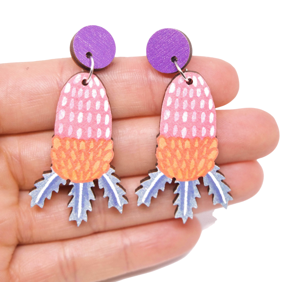 Made in Australia from our original hand painted design, these earrings are printed with eco-friendly inks onto light weight, sustainably grown hoop pine and paired with stainless steel posts, perfect for sensitive ears!