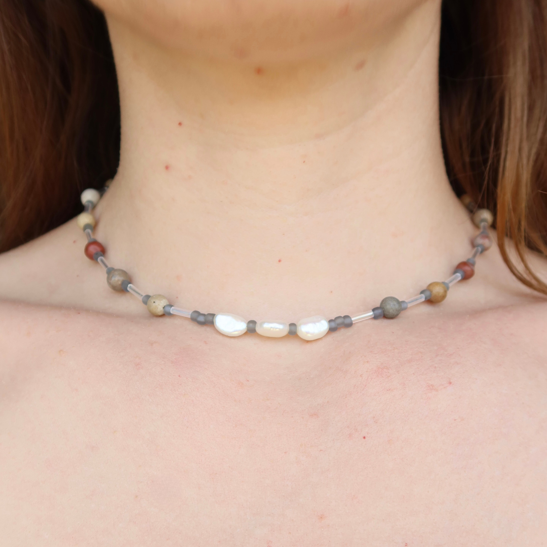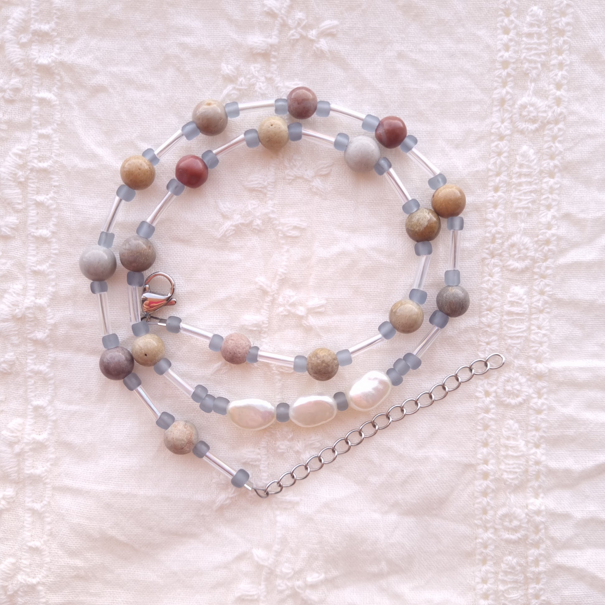 - Hand beaded necklace with pearls, fossilised coral and glass beads.