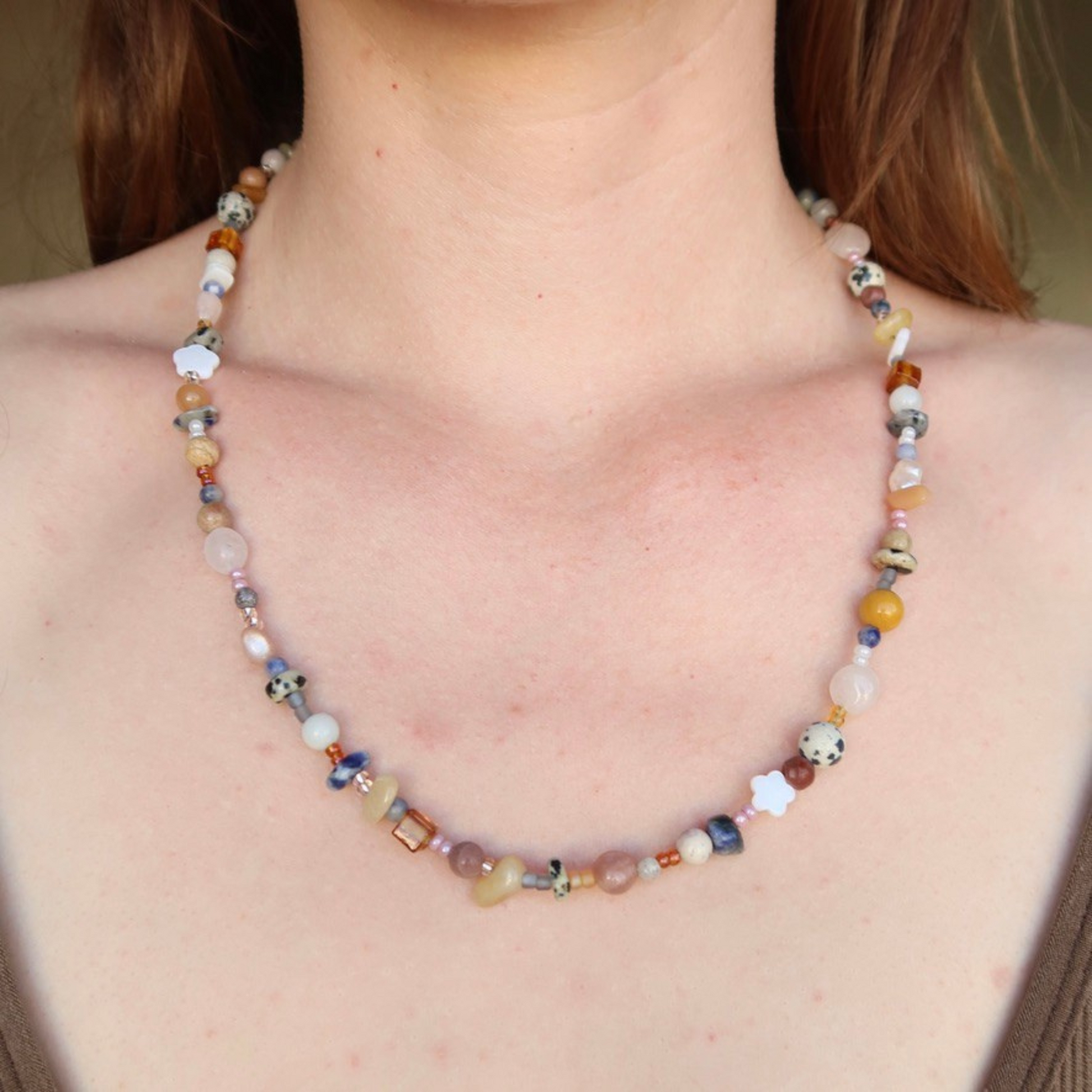 - Hand beaded necklace with pearl, shell, gemstones and glass beads