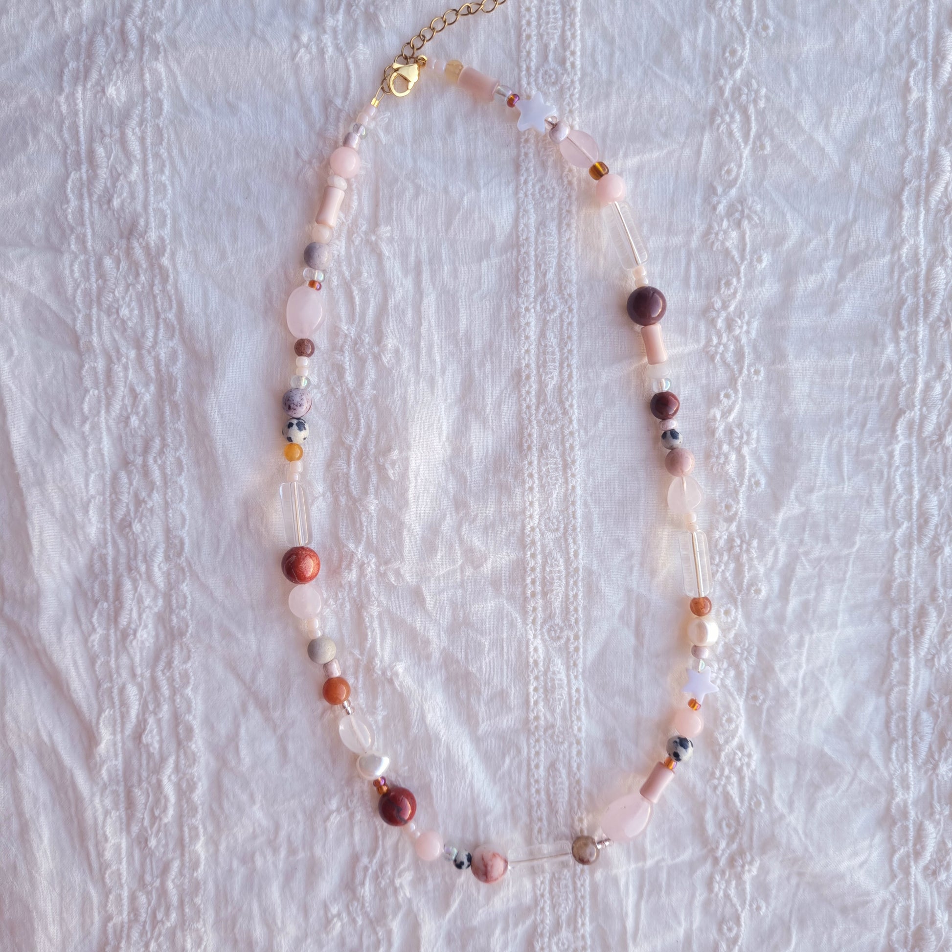 - Hand beaded necklace with pearl, shell, gemstones and glass beads
