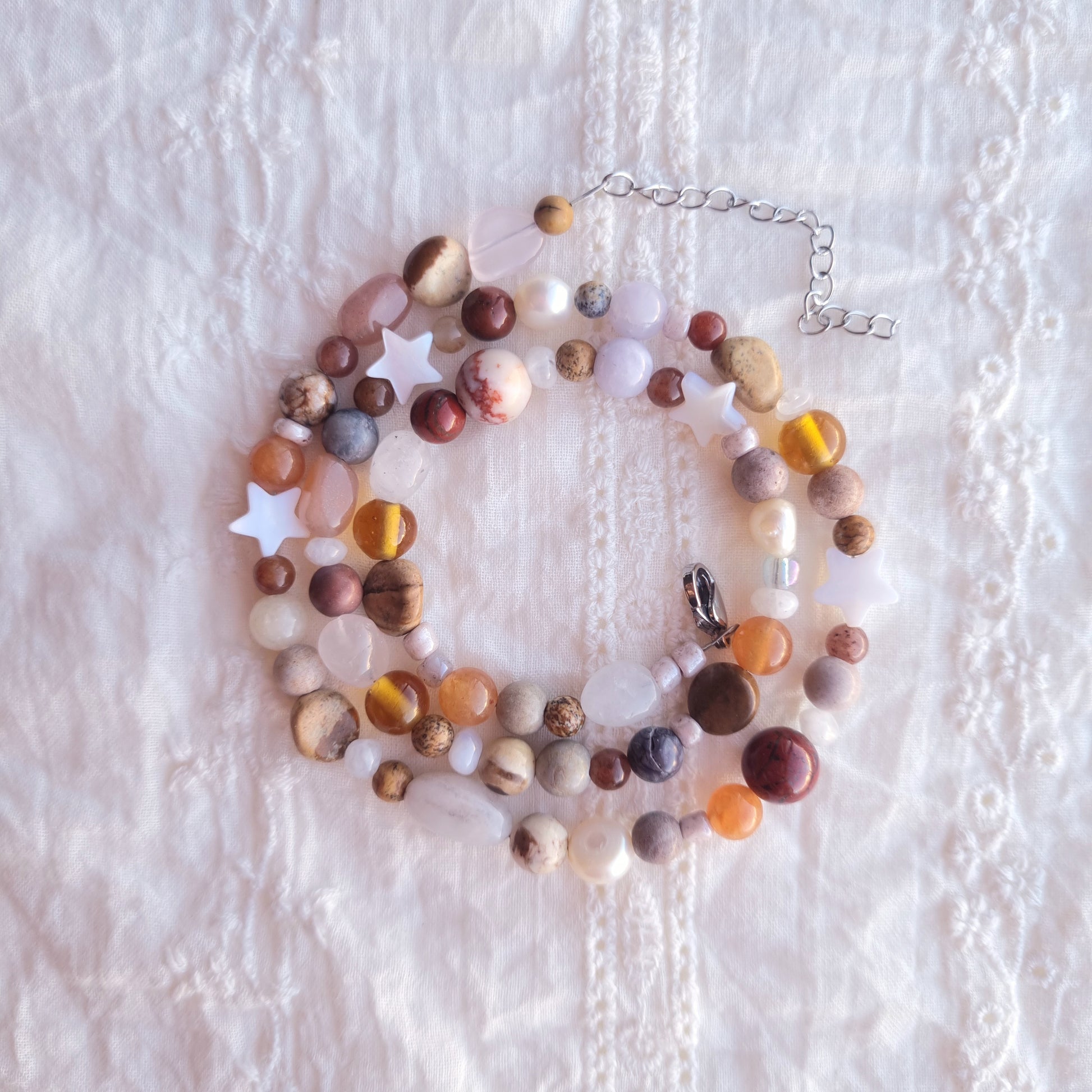 - Hand beaded necklace with pearl, shell, gemstones and glass beads