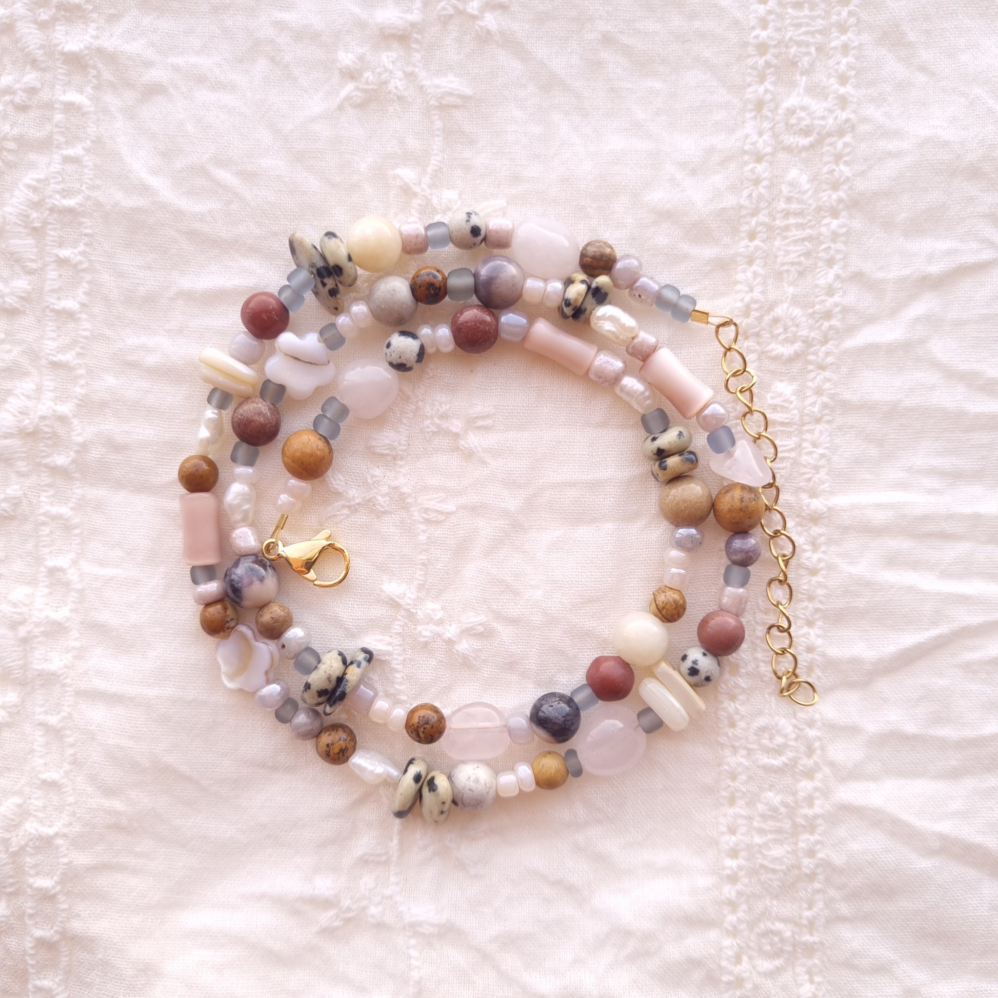 - Hand beaded necklace with pearls, gemstones, and glass beads