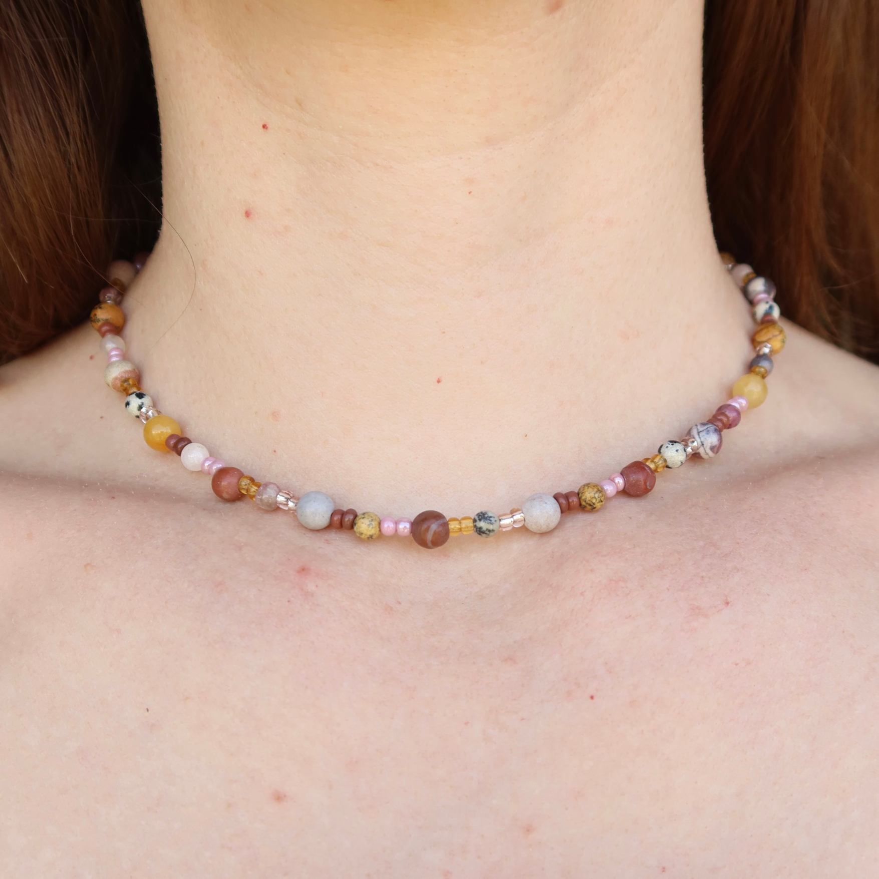 - Hand beaded necklace with gemstones and glass beads