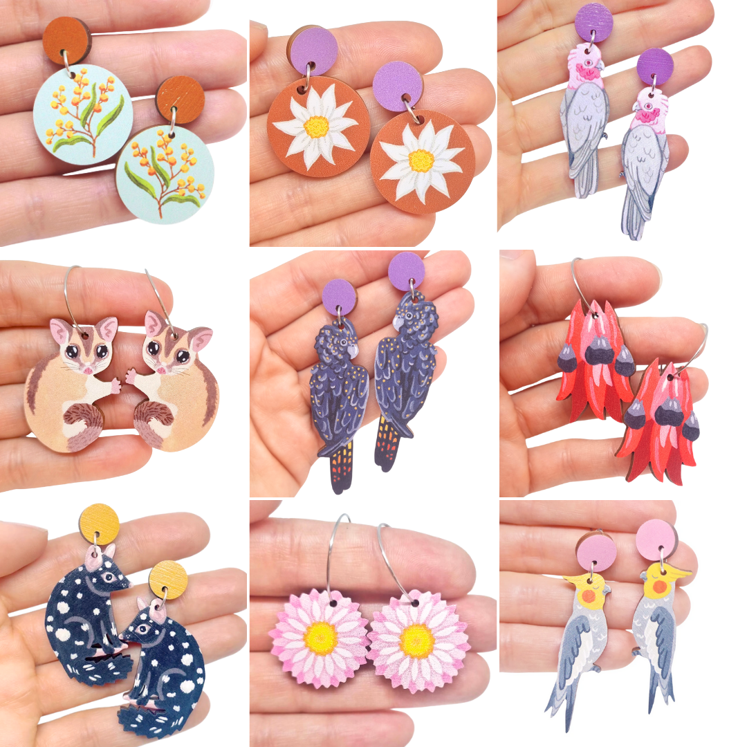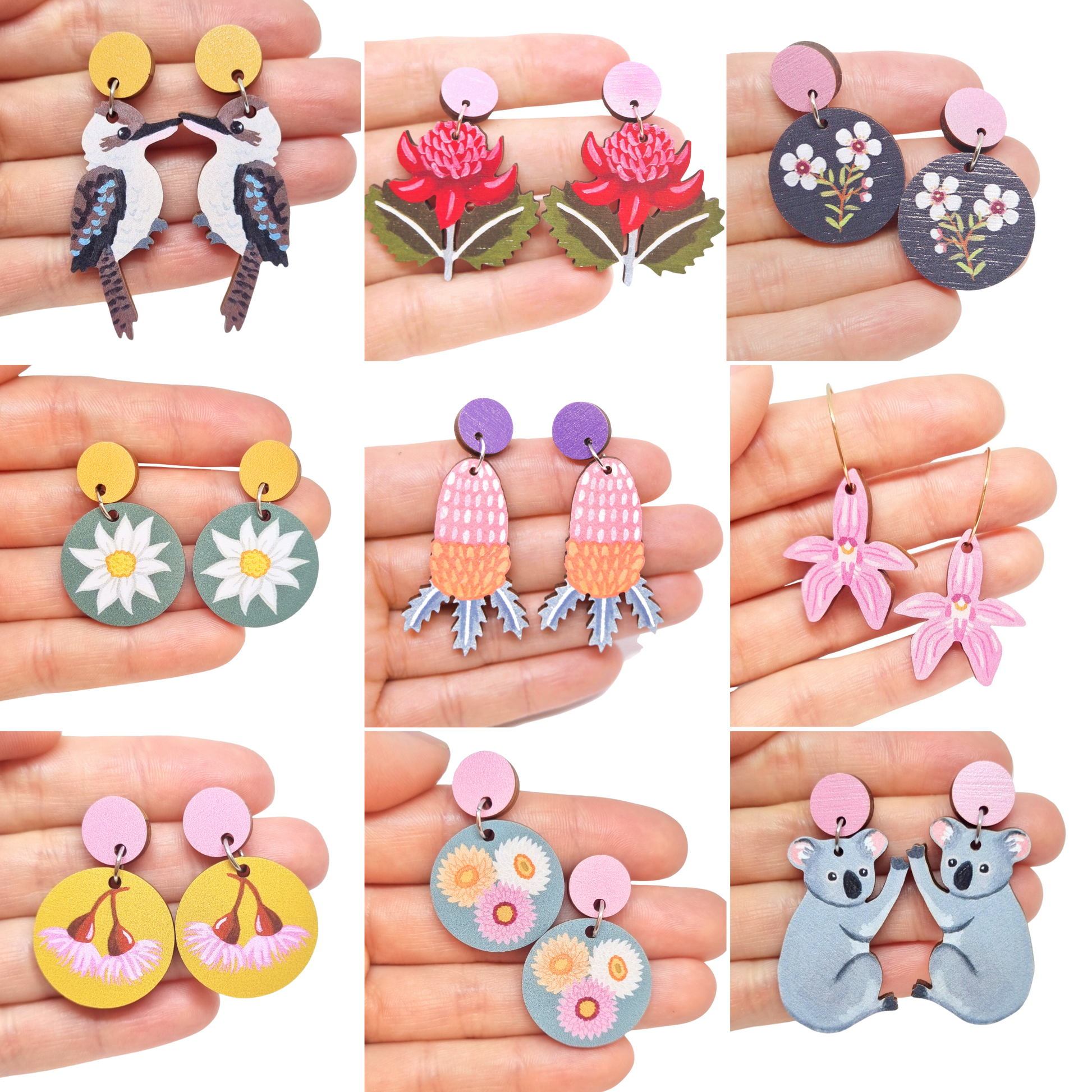 These are our seconds pairs available at half price! The findings and stud parts are in perfect condition, the only faults are things such as small chips on the wood or dents and print errors such as slightly pixelated or cut off-center.