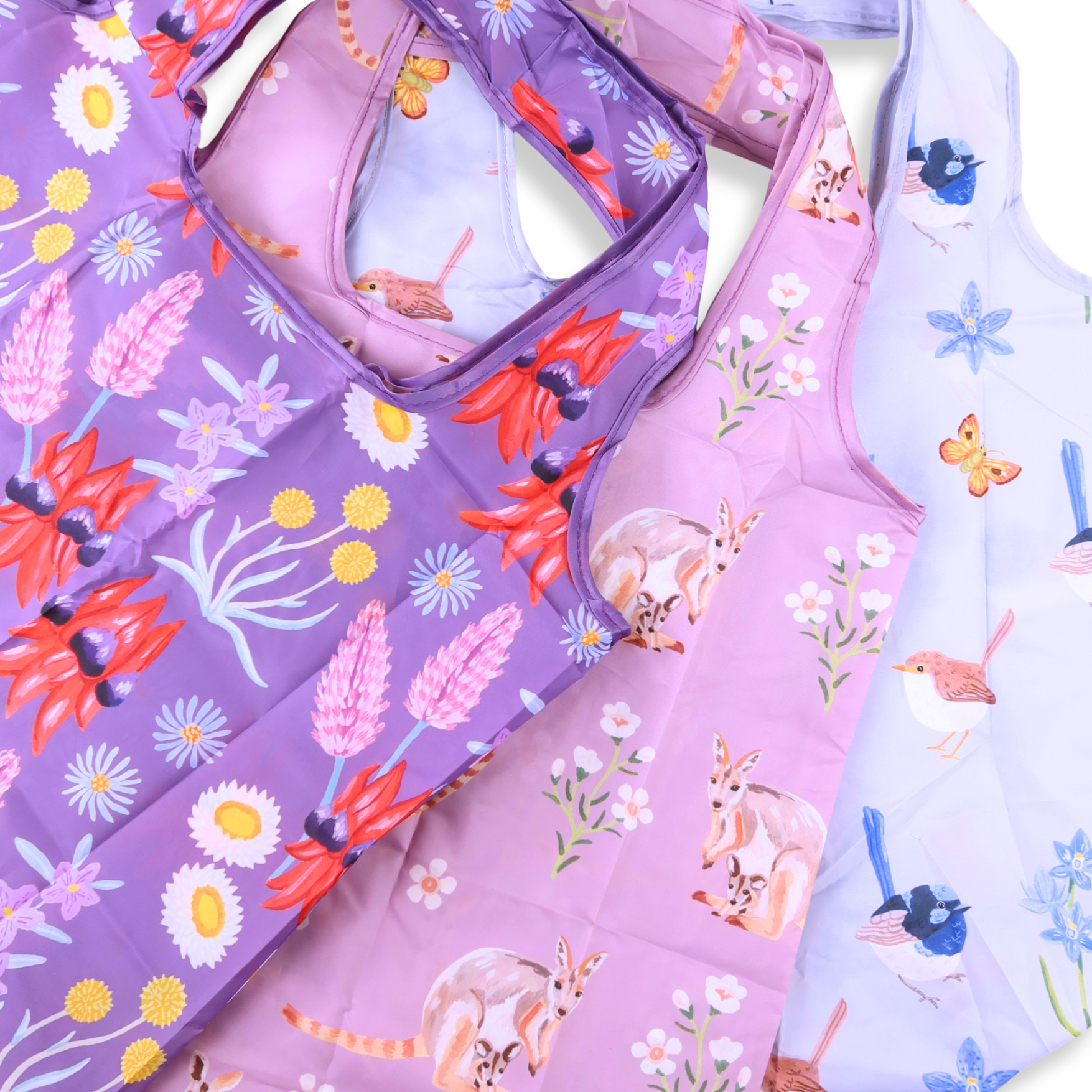 Our reusable shopping bags are designed for everyday convenience and are strong, lightweight and made from recycled plastic bottles. Each bag features original Pixie Nut Australian designs, combining sustainability with style.