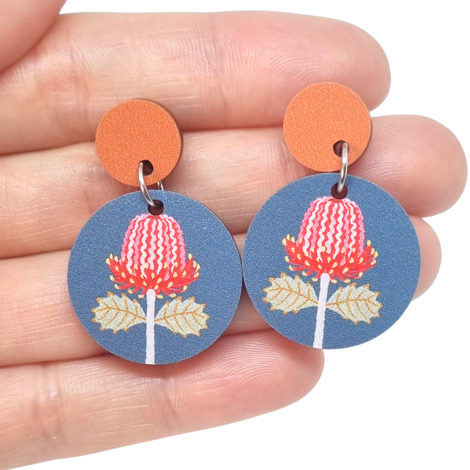 Made from our original hand painted design, these earrings are printed with eco-friendly inks, onto light weight sustainably grown hoop pine and paired with stainless steel posts, perfect for sensitive ears!